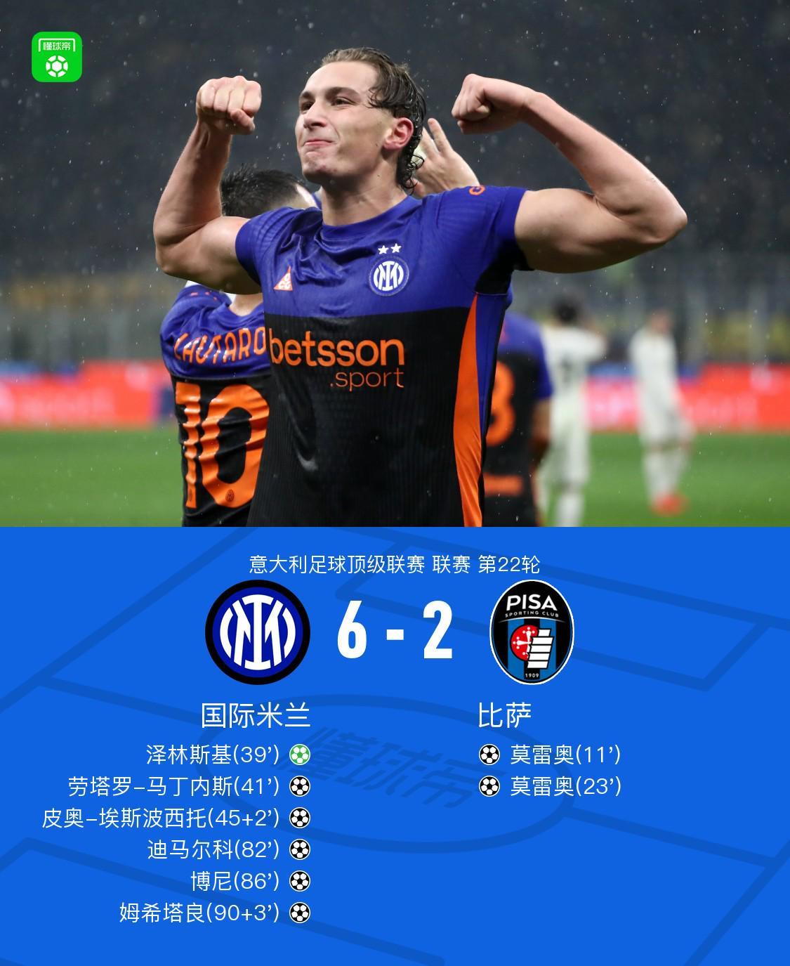 北京时间1月24日,意大利足球顶级联赛意甲联赛第22轮,国际米兰主场对阵比萨。上半场莫雷奥头顶脚踢梅开二度,泽林斯基点射破门,劳塔罗头球建功,皮奥头球反超,下半场迪马尔科弹射得分,博尼低射破门,姆希塔良锁定胜局。最终,国际米兰6比2战胜比萨。